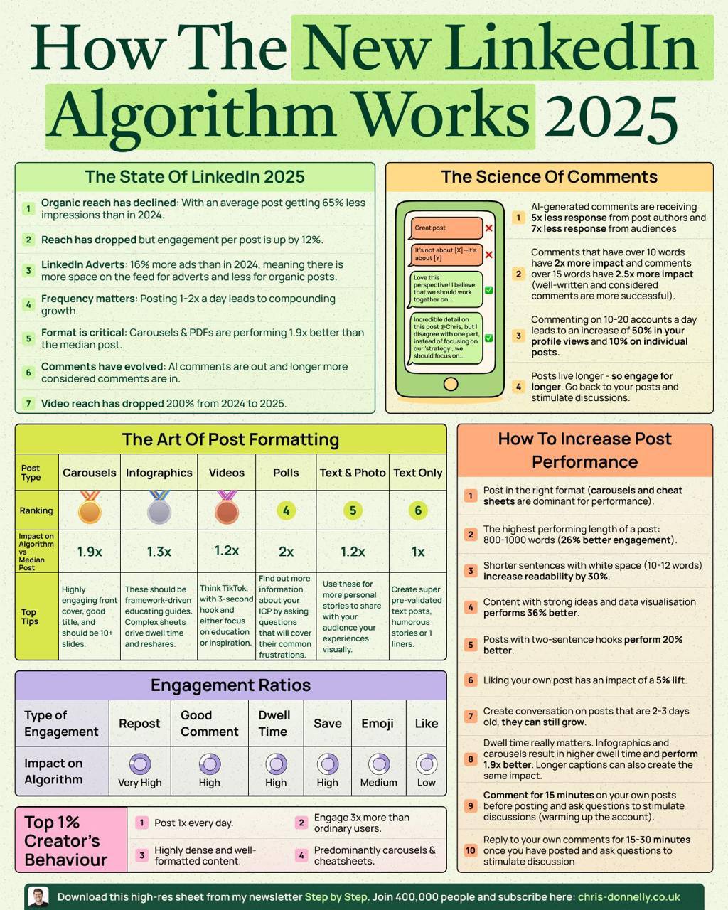 If your goal is LinkedIn growth, prioritize carousels and cheat sheets, as they perform significantly better than other formats.