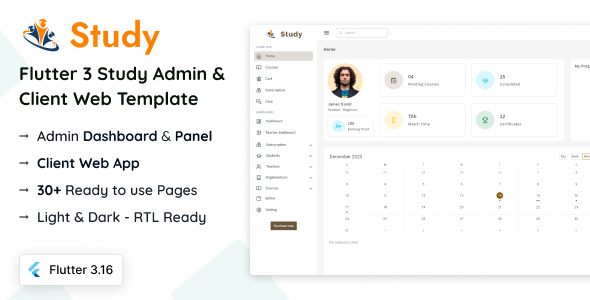 For educational technology applications, the Study dashboard template offers a stunning and effective way to manage online courses. This template allows for ease of tracking progress and delivering content to students and clients efficiently.