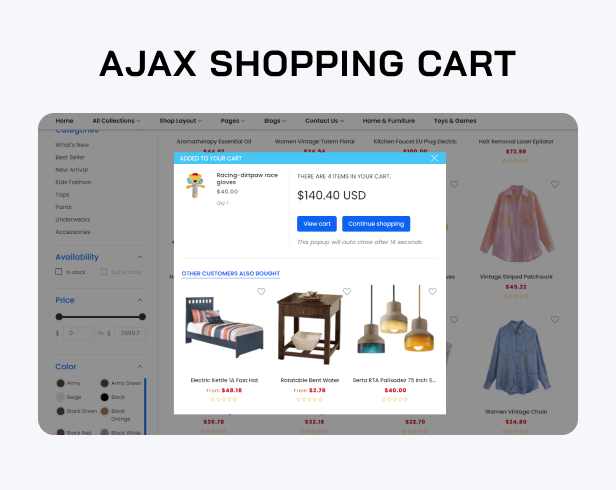- A lot of Ajax functions: Quick view, Add to cart, Wishlist, Compare, Upsells,...