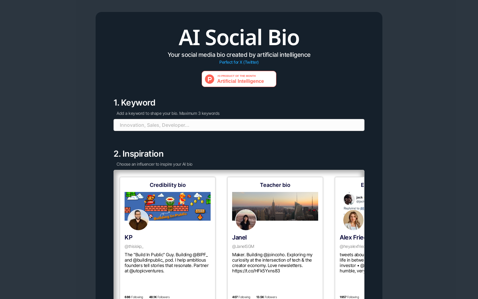 Create the perfect social media bio using AI. Use the AI Social Bio generator to get the best Twitter, LinkedIn and Instagram bio.