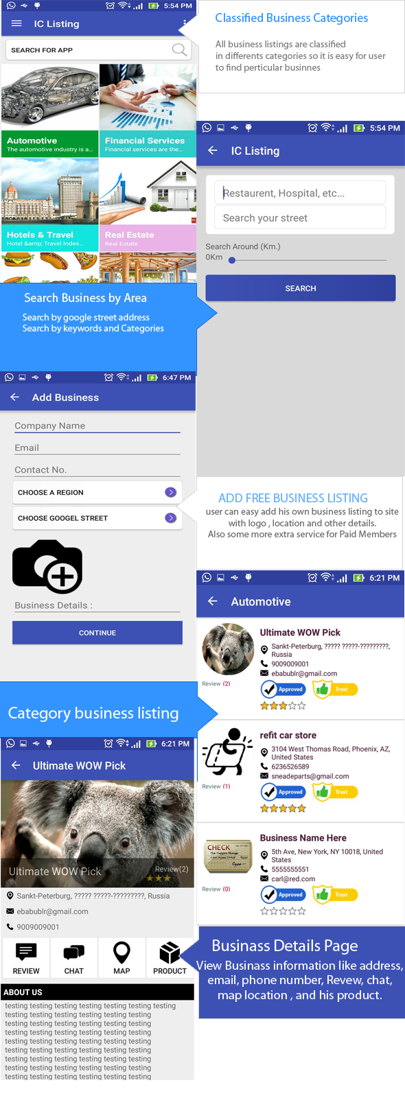 User can add free or paid listing in this App also he can get business from it. Here feature of business listing profile and other details like business photos, google map street location and other more features.