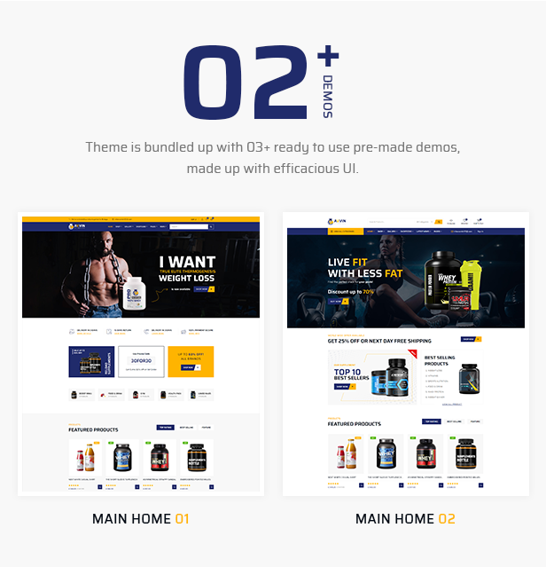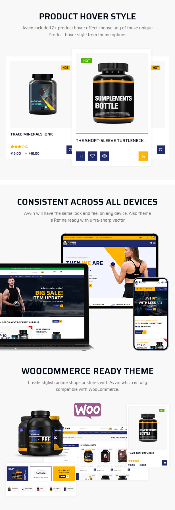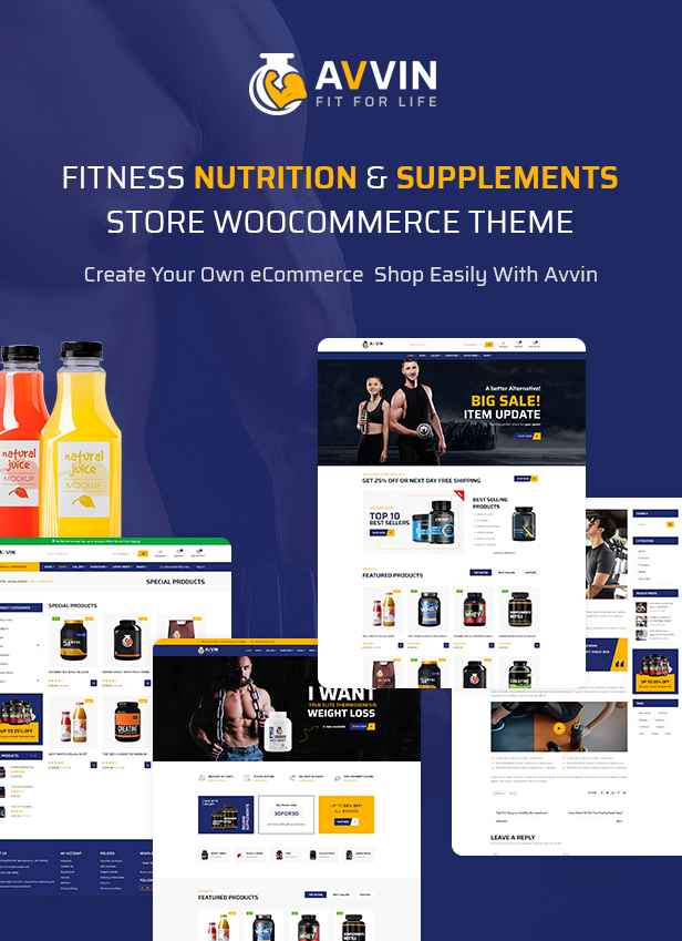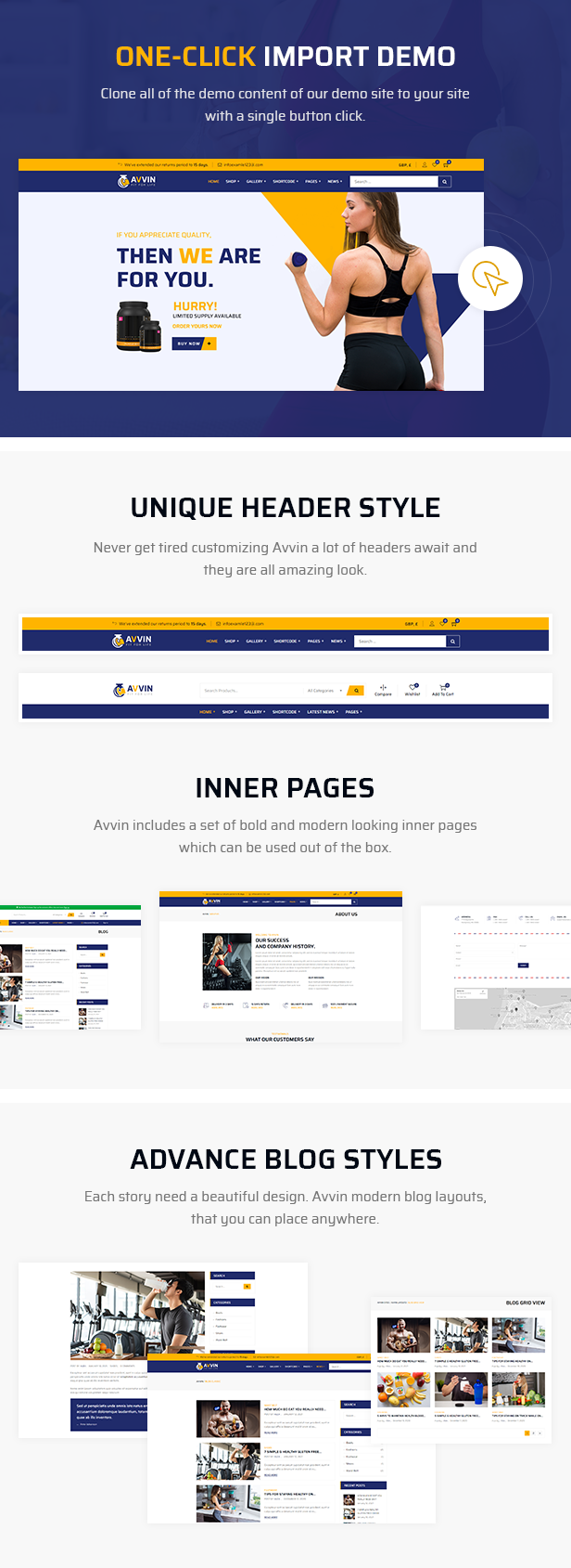 Avvin is a attractive and flexible Multipurpose WooCommerce Theme for gym, fitness, health supplements, sports & nutrition, body enhancement product, weight loss & diet product, medicine product, nutrition pharmacy shop and all health products shop website. It comes with a lot of features and variations: Responsive Layout, Mega Menu, WPBakery Page Builder, Awesome Slider Revolution, Product Quick View, Ajax Search, Ajax Cart, Easy One Click Demo Import, ... and so much more.