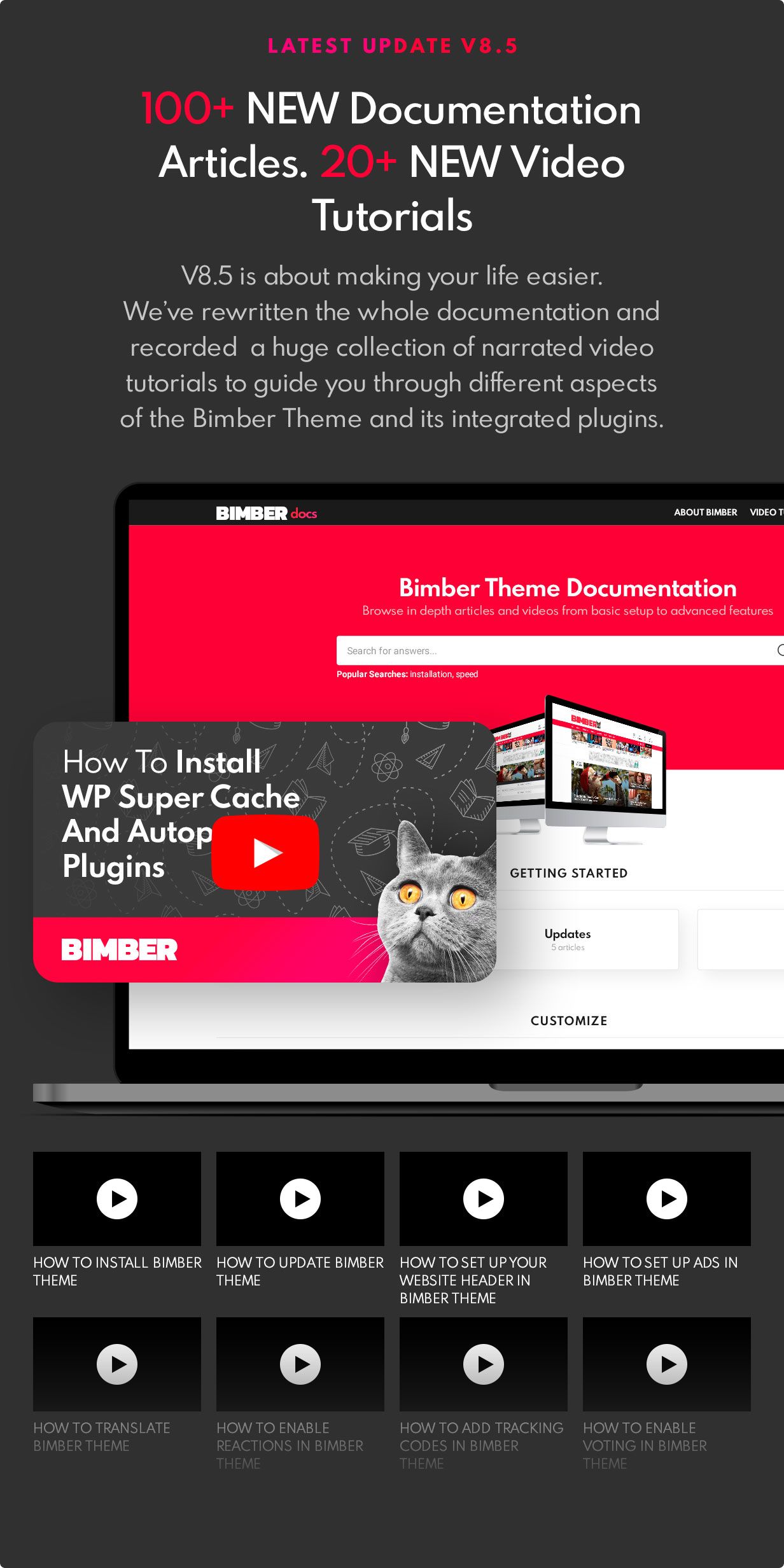 # NEW - Video tutorials # NEW - Documentation rewritten # Improved - AdAce plugin: jQuery Migrate warnings # Improved - Compatibility with menu visibility control plugins like If Menu # Improved - WP Bakery Page Builder plugin latest version # Improved - Easy Social Share Buttons plugin latest version # Fixed - Grid post templates: better responsiveness # Fixed - Snax plugin: misaligned icons on Windows # Fixed - Snax plugin: Browse button doesn't work on mobile, in tabs # Fixed - Snax plugin: line break tags are stripped from Froala content # Fixed - MediaAce plugin: YT related videos option removed as no longer supported by YT # Fixed - Elementor: multiple categories selection in Bimber Collection widget