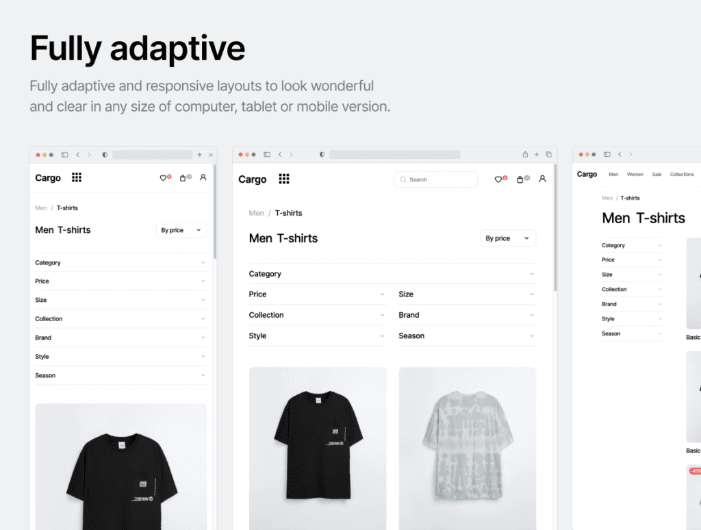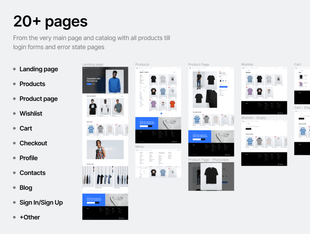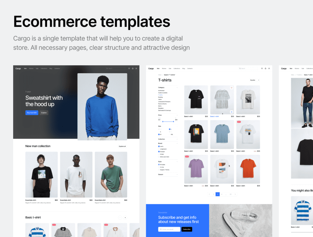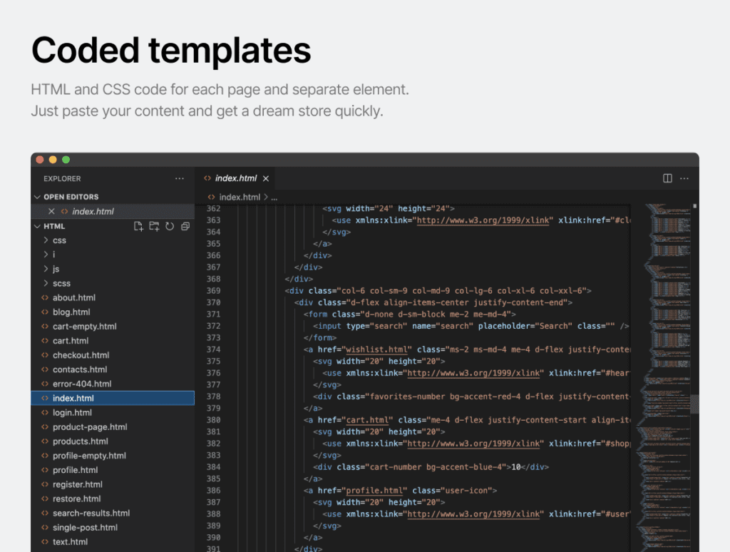 E-Commerce templates that will help you to create a digital store with all necessary pages, clear structure and attractive design. From the very main page and catalog with all products till login forms and error state pages. Each page and separate element have HTML and CSS code. Just paste your content and get a dream store quickly.