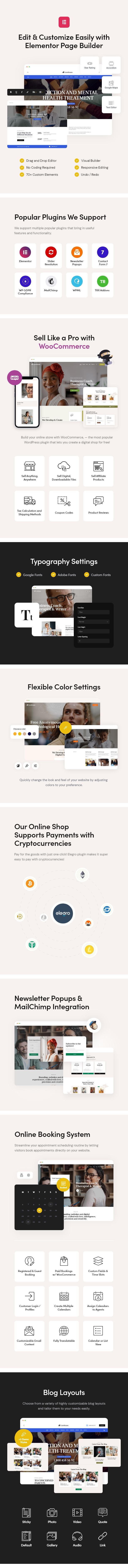 Cerebrum has an intuitive visual interface and informative layout that looks wonderful on any platform since it’ss fully responsive and Retina ready. With its minimal design, you can represent your practice in the best way. The theme is compatible with a bundle of premium plugins: Revolution Slider, MailChimp for WP, Elementor page builder and Elegro Crypto Payment for creating Psychological & Medical Practice website.