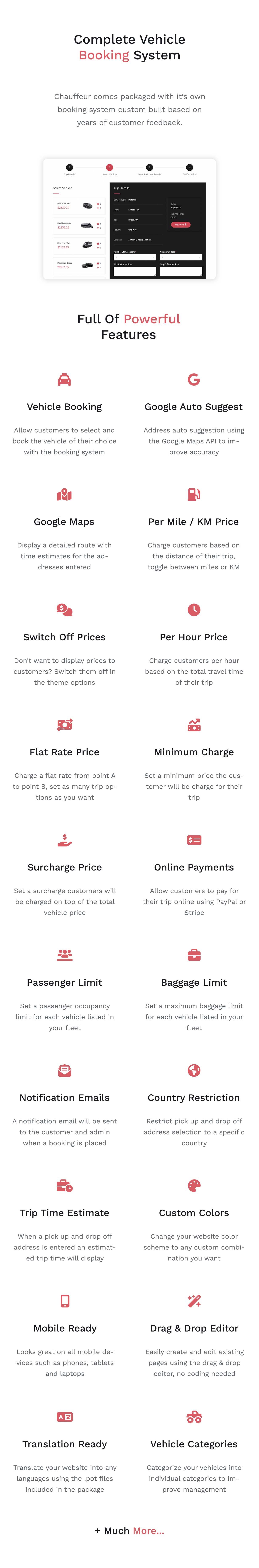 Chauffeur comes packaged with it’s own booking system custom built based on years of customer feedback. It should contain every feature you need, but if you feel something is missing please get in touch, I’m always open to feedback and feature requests
