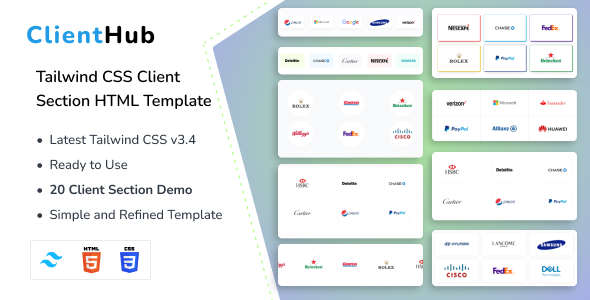 Introducing ClientHub – Tailwind CSS 3 Client Section HTML Template that enhances your client interactions. Boasting a contemporary and responsive layout, adorned with chic gradients and captivating wave effects, ClientHub guarantees a visually striking and immersive interface. Its sleek design facilitates seamless customization, making it the ideal choice for crafting personal profiles or business landing pages. Developed with the latest Tailwind CSS v3 framework, ClientHub effortlessly combines sophistication with functionality. Whether you’re creating a personal profile or a professional landing page, ClientHub offers easy customization. With cross-browser and device compatibility, ClientHub ensures a smooth and captivating user experience, presenting your content in a modern and visually appealing manner. Opt for ClientHub to redefine your online presence, showcasing a polished design and contemporary aesthetics that make a lasting impact.