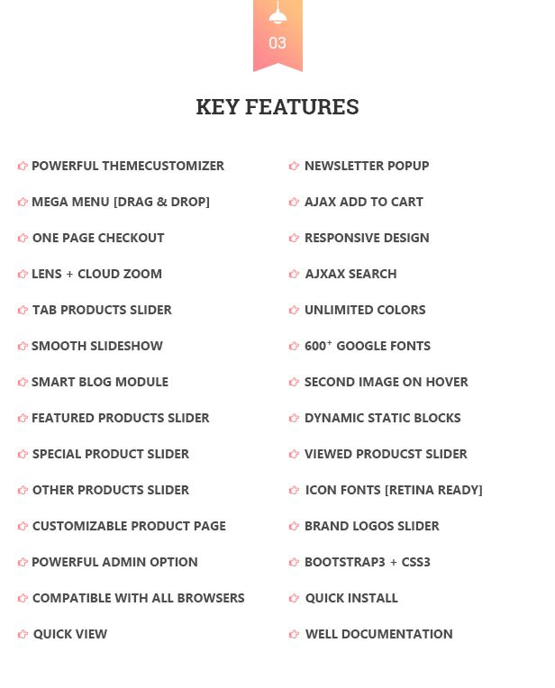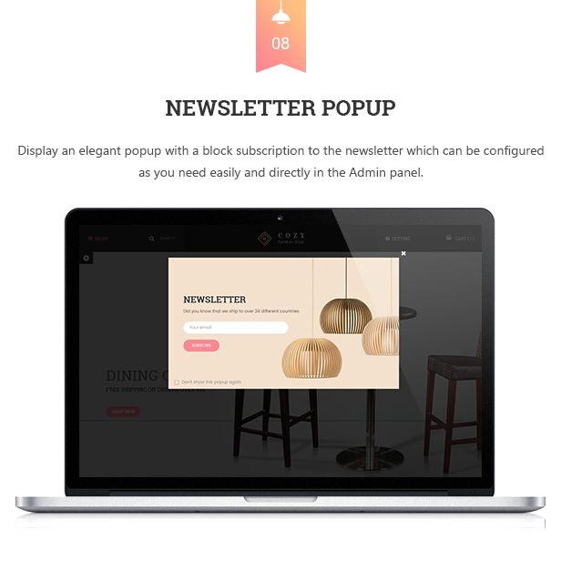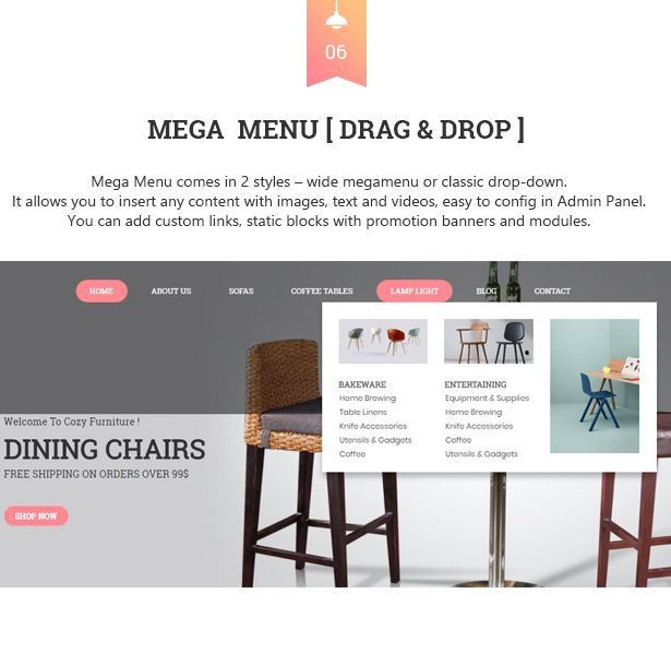 Home page is designed eye-catching with full width and boxed slideshows. Slideshow is great with smooth transitions of texts and nice images. Besides, Cozy Furniture Theme is designed with a modern and new style and new web technologies: Font Awesome 4, W3C, CSS3, HTML5 helping customers to display products professionally.