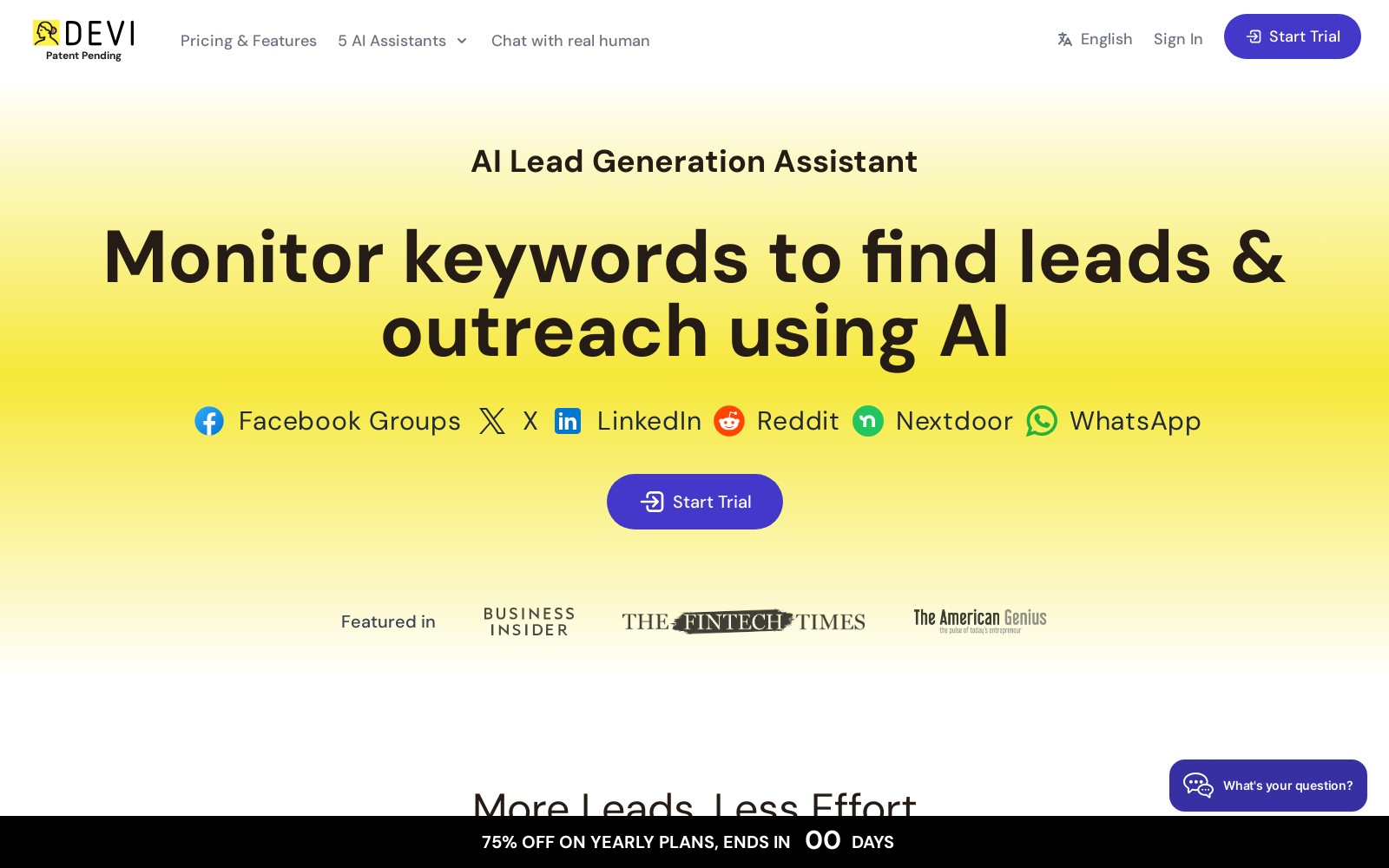 Devi monitors keywords in Facebook groups, LinkedIn, Twitter, and Reddit, and outreach using ChatGPT or Bard to close deal. Devi also create and schedule content using AI on all social media profiles. With Devi, you can spend less time on social media and more time growing your business.