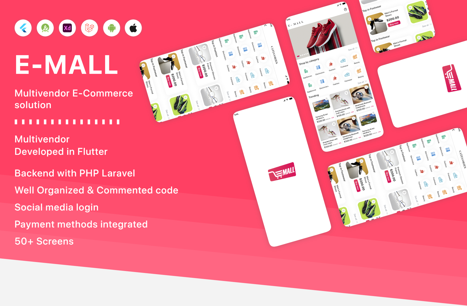 Emall is a multi-vendor, multi-store ecommerce application that is built with Flutter and a Laravel panel. The application allows multiple vendors to register and sell their products on a single platform, and also allows for the creation of multiple stores within the same platform. This means that the app can cater to a wide range of businesses, from small independent sellers to large enterprises.
