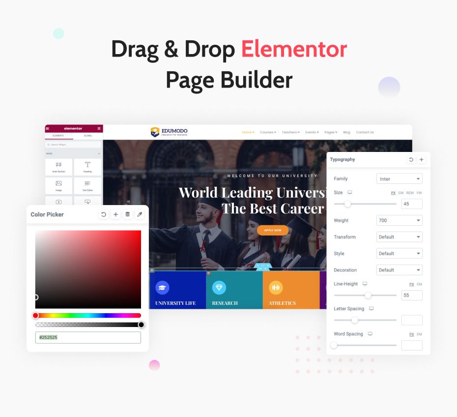 Build your site quickly with the no.1 WordPress page builder Elementor. You will not strive to create any page or content for your educational website, as Edumodo is entirely compatible with Elementor. There is no prior coding knowledge is needed to use this page builder, just simple drag & drop the elements on the frontend and take full control over your website.