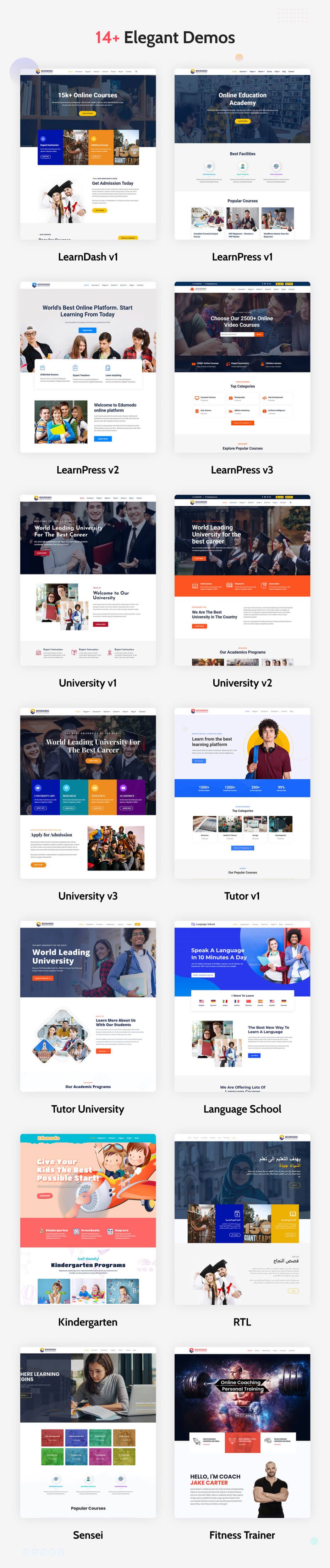 4.4.3 - ( 2 May 2023 ) ========================= Fixed - Individual page header enable/disable option isn't working issue. Fixed - Individual page header background isn't working issue. Fixed - LearnPress course single review progress bars color visibility issue and tab contents. Added - An option to change the background of the LearnPress course single page header area. Improved - LearnPress course single header area with course meta. Improved - LearnPress course single page's comment form and sidebar area. Updated - Removed unnecessary options for the teacher single. 4.4.2.1 - ( 6 March 2023 ) ========================= Add - Make it compatible with the Event Tickets plugin. 4.4.2 - ( 21 February 2023 ) ========================= Fix - Demo import issue of the Language School demo 4.4.1.1 - ( 13 January 2023 ) ========================= Fix - Dev dependencies issue 4.4.1 - ( 8 January 2023 ) ========================= Fix - The header profile button text and URL not changing issues. Fix - The Font Awesome icons visibility issue. Add - Why choose us section using the Advanced Tab element in LearnDash demo. 4.4.0 - ( 2 January 2023 ) ========================= Fix - The sticky header responsive menu issue. Update - The documentation file. 4.3.16 - ( 18 December 2022 ) ========================= Fix - WooCommerce product category page's wrong page title issue. 4.3.15 - ( 16 December 2022 ) ========================= Fix - The header top menu visibility issue. 4.3.14 - ( 5 December 2022 ) ========================= Fix - Footer layout and copyright options are not working issue. Fix - Footer credit URL option is not working issue. 4.3.13 - ( 15 November 2022 ) ========================= Fix - Customizer blog layout and column option not working issue. Fix - Header icons visibility and link not working issue. 4.3.12 - ( 23 October 2022 ) ========================= Fix - Primary color issue of the LearnPress single course page. Fix - Responsive issue of the LearnPress single course page. Fix - Spacing issues of the LearnPress single course page. Improved - LearnPress single course page styles. 4.3.11 - ( 20 September 2022 ) ========================= Update - Tutor University demo 4.3.10 - ( 19 September 2022 ) ========================= Update - Make it compatible with Tutor LMS latest version Update - Tutor V1 demo. 4.3.9 - ( 30 August 2022 ) ========================= Fix - LearnDash course archive and sidebar spacing issue. Fix - Blog comment form spacing issue. Fix - LearnDash course single page's title duplicate issue. Fix - Tutor LMS course single page's title duplicate issue. Update - University V1, V2, and V3 demo Update - LearnDash V1 demo 4.3.8 - ( 21 August 2022 ) ========================= Add - Login and Registration button in the header top. Add - Search Form and Mini Cart in the header. Add - Responsive off-canvas menu. Improve - Page Title and Breadcrumb area. 4.3.7 - ( 28 July 2022 ) ========================= Improve - LearnPress V3 Demo 4.3.6 - ( 26 July 2022 ) ========================= Improve - LearnPress V2 Demo 4.3.4 - ( 19 May 2022 ) ========================= Improve - Event Details page design 4.3.3 - ( 26 April 2022 ) ========================= Fix - Edumodo Core plugin's deprecated functions issue 4.3.2 - ( 20 April 2022 ) ========================= Fix - Tutor LMS 2.0 styles issue Improve - Blog page and widgets Update - WidgetKit Pro plugin 4.3.1 - ( 28 Mar 2022 ) ========================= Fix - Edumodo Core plugin conflict issue with the Elementor plugin. 4.3.0 - ( 3 Mar 2022 ) ========================= Added - Tutor V1 demo. 4.2.7 - ( 14 Feb 2022 ) ========================= Fix - Dropdown menu parent item link issue Fix - LearnDash LMS Admin panel select style broken issue 4.2.6 - ( 08 Feb 2022 ) ========================= Fix - Demo import issue of University V2, V3, and LearnPress V2 4.2.5 - ( 02 Feb 2022 ) ========================= Fix - LearnPress Profile style broken issue. 4.2.4 - ( 31 Jan 2022 ) ========================= Fix - Demo import issue of University V1 and LaernPress V1 Fix - LaernPress breadcrumb style issue. 4.2.3 - ( 09 Jan 2022 ) ========================= Fix - Extra spacing issue of the page title. Fix - Menu hover select all items issue. Fix - Remove unnecessary required plugins. 4.2.2 - ( 04 Nov 2021 ) ========================= Fix - customizer typography setting issue. Fix - LearnDash PayPal currency issue. Fix - LearnDash "Take Course" button visibility issue. 4.2.1 - ( 21 Oct 2021 ) ========================= Fix - LearnPress and LearnDash course RTL issues. 4.2 - ( 21 Sep 2021 ) ========================= Update - Edumodo Kids Child theme updated. Update - Edumodo Kids demo data updated. Update - Child theme header sync with customizer. Update - Child theme footer sync with customizer 4.1.6 - ( 15 Sep 2021 ) ========================= Update - Language School Homepage. Update - WidgetKit Pro updated to latest version. 4.1.5 - ( 01 Sep 2021 ) ========================= Update - LearnDash v1 homepage. 4.1.4 - ( 26 Aug 2021 ) ========================= New - LearnPress v3 homepage. Update - Customizer data update for University v2. Update - Fix conflict between sensei and tutor template. 4.1.3 - ( 17 Aug 2021 ) ========================= Update - University v2 homepage. Update - University v3 homepage. Update - LearnPress integration inside University v2. Update - LearnPress integration inside University v3. Update - Default Widgets style. Fix - Pagination color sync with primary color. 4.1.2 - ( 10 Aug 2021 ) ========================= Update - University v1 homepage. Update - LearnPress integration inside University v1. Fix - Scroll issue. Fix - Elementor Text widget style sync problem. 4.1.1 - ( 15 July 2021 ) ========================= Update - All Demo Data. Update - Footer style. Update - LearnPress 4.0 integration. Update - Sensei single course style updated for it's latest version. Update - Sensei course archive style updated for its's latest version. Up
