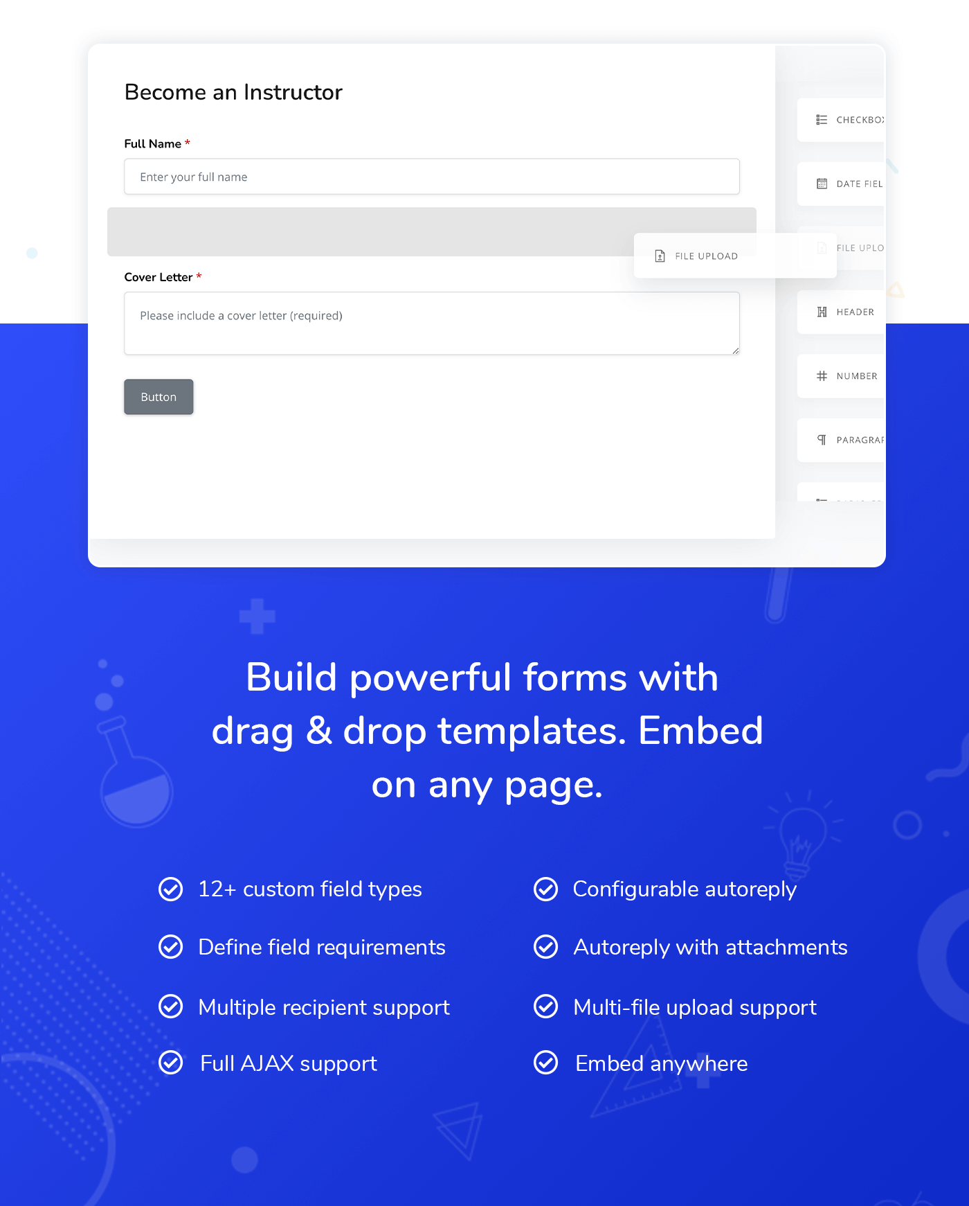 Edumy’s exclusive Drag & Drop Form Builder allows you to build complex web-forms in minutes. Built with React, Cocoon Form Builder provides 12+ custom field types with unlimited options. Customize settings for each field, and create custom fields with specified validation requirements. Cocoon Form Builder supports secure multi-file uploads and does not store files on the server for maximum security and peace of mind.