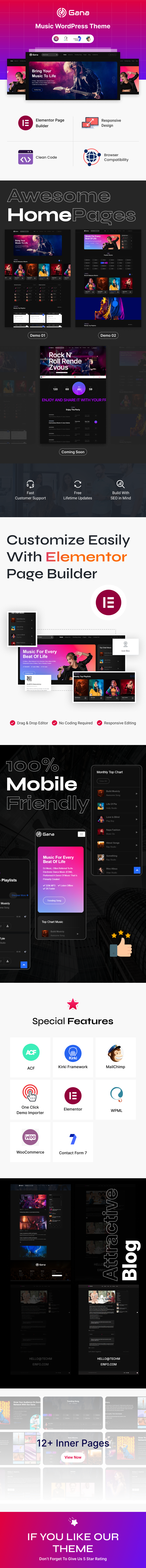 Welcome to Gana, where music is everything! We designed Gana for all types of modern music websites, so if you are a record label, an artist, a music blogger, or if you run a music store or a music festival, this theme was designed with you in mind. The theme comes with 02 stunning & fully flexible homepage layouts, full Elementor compatibility, tons of music elements and more. Create your website with Gana today, it will be like music to your visitor’s ears!