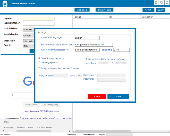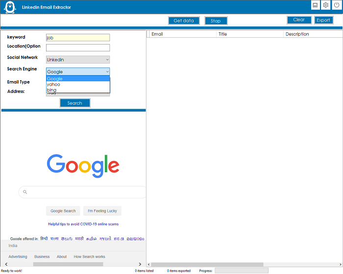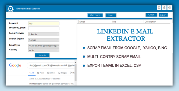 - Search Engin : You can Scrap Linkedin Email from mutlipe Search Engine: Google , Yahoo, Bing .