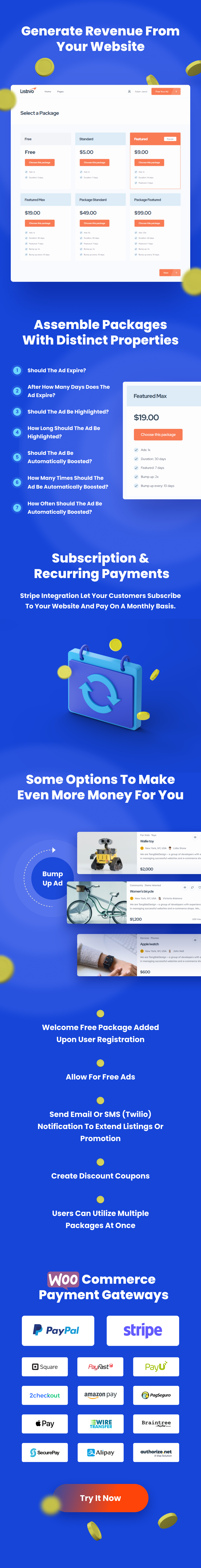 Monetization System – WooCommerce Payment Gateways – Listivo has a monetization system that allows you to earn when users submit listings. You can configure PayPal, Stripe, Visa, Mastercard, Wire Transfer, Square, Apple Pay, Alipay, Braintree, PayU, PayFast, SecurePay, Authorize.Net, 2checkout, Amazon Pay, PagSeguro and many many other WooCommerce Payment Getaways.