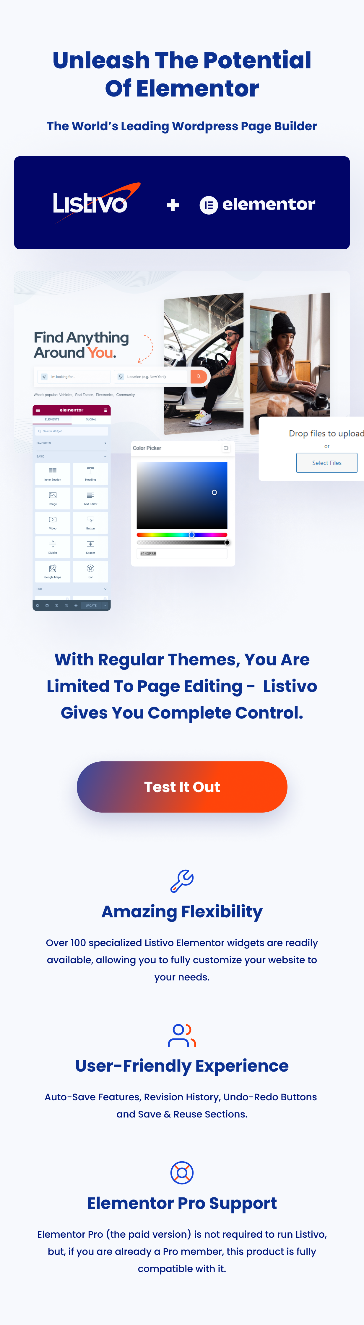 Elementor Plugin Integration – Listivo is based on the Elementor Free plugin and we spend thousands of hours adding extra value to it. Create Any Website You Can Imagine. You can modify everything: Homepage, all pages (e.g., Contact / About), Single Listing Page, Results Page, User Page. It is the most flexible and easy-to-use solution on the market for directory websites. Our developers created dozens of new elements that you can “drag-and-drop” to make sure the page builder is ultra-flexible and fully integrated with Listivo. Elementor Pro (paid) version is not required to run Listivo, but if you like to use it this product is fully compatible.