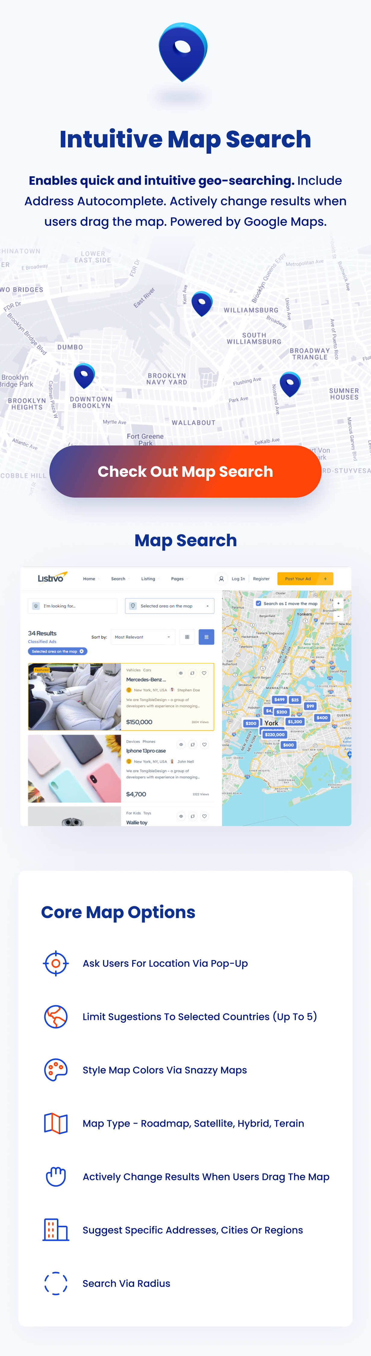 Flexible Menu – Listivo has a great menu that includes sticky and transparent options. The mobile menu was designed as off-canvas.