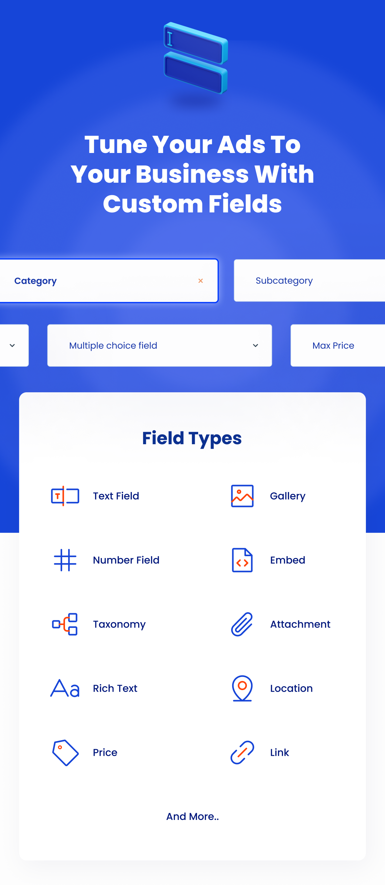 Powerful Listings Inventory – You can change the look of your listings inventory by creating your own fields and modifying the existing options. There are nine types of fields: Text, Number, Taxonomy, Rich Text, Price, Gallery, Location, Embed (Video) and Attachments.