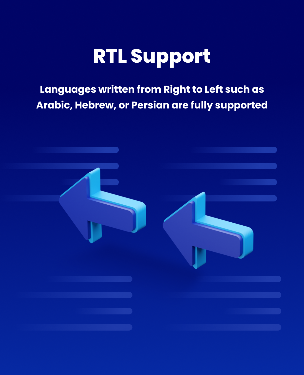 RTL (right-to-left alphabet) – Languages written from Right to Left such as Arabic, Hebrew, or Persian are fully supported