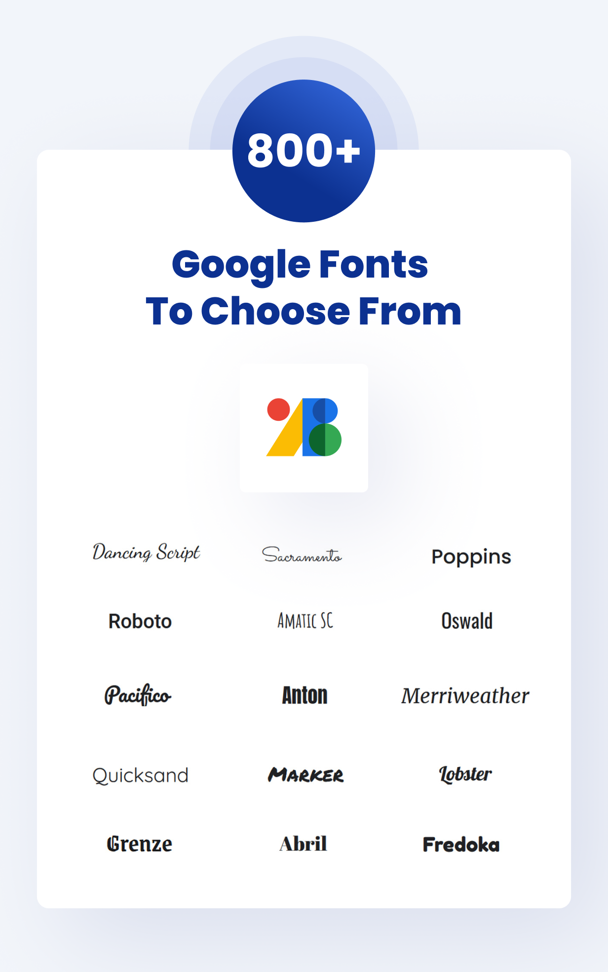 Global Body & Headings Google Fonts – Choose body and heading font in your setup panel. It will automatically be displayed on all of your pages. 800+ fonts are available.