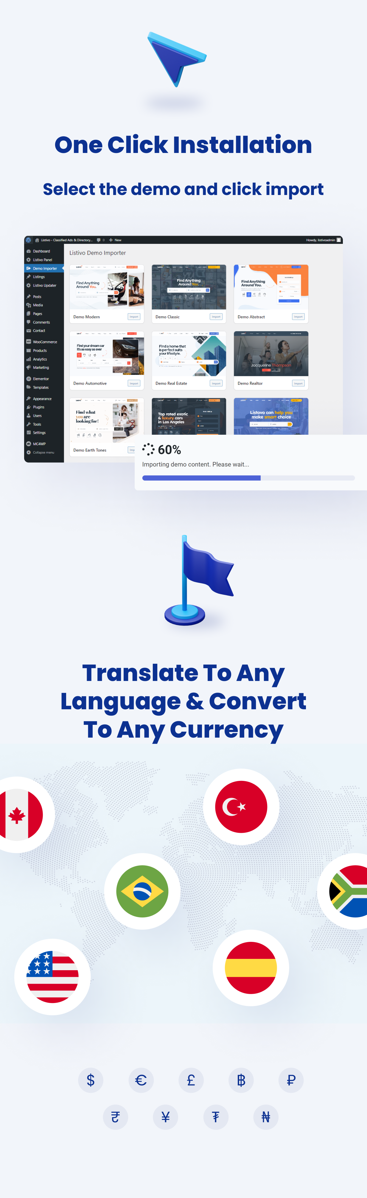 Single Click Import – Demo and all pages are automatically imported after one click. It will save you time and allow you to quickly start your customizations. The demo package does not include users’ photos and has only a few sample listings added.