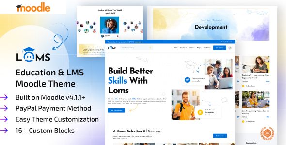 Loms is a responsive clean Moodle theme especially built for Education LMS and Online Courses websites! It is suitable for online course providers, online training, learning management, educational institutes, LMS, etc., online platforms.