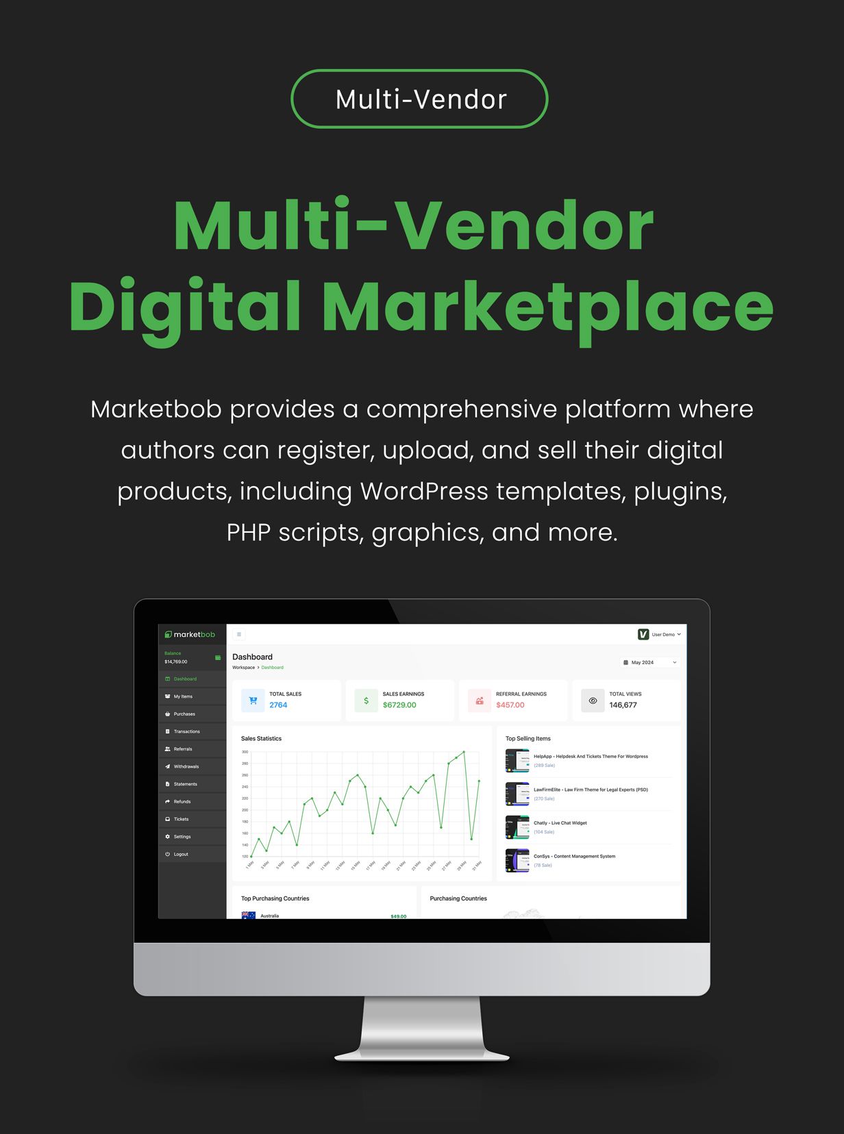 Marketbob is a powerful PHP script designed to create a dynamic and multi-vendor digital marketplace. This script provides a comprehensive platform where authors can register, upload, and sell their digital products, including WordPress templates, plugins,