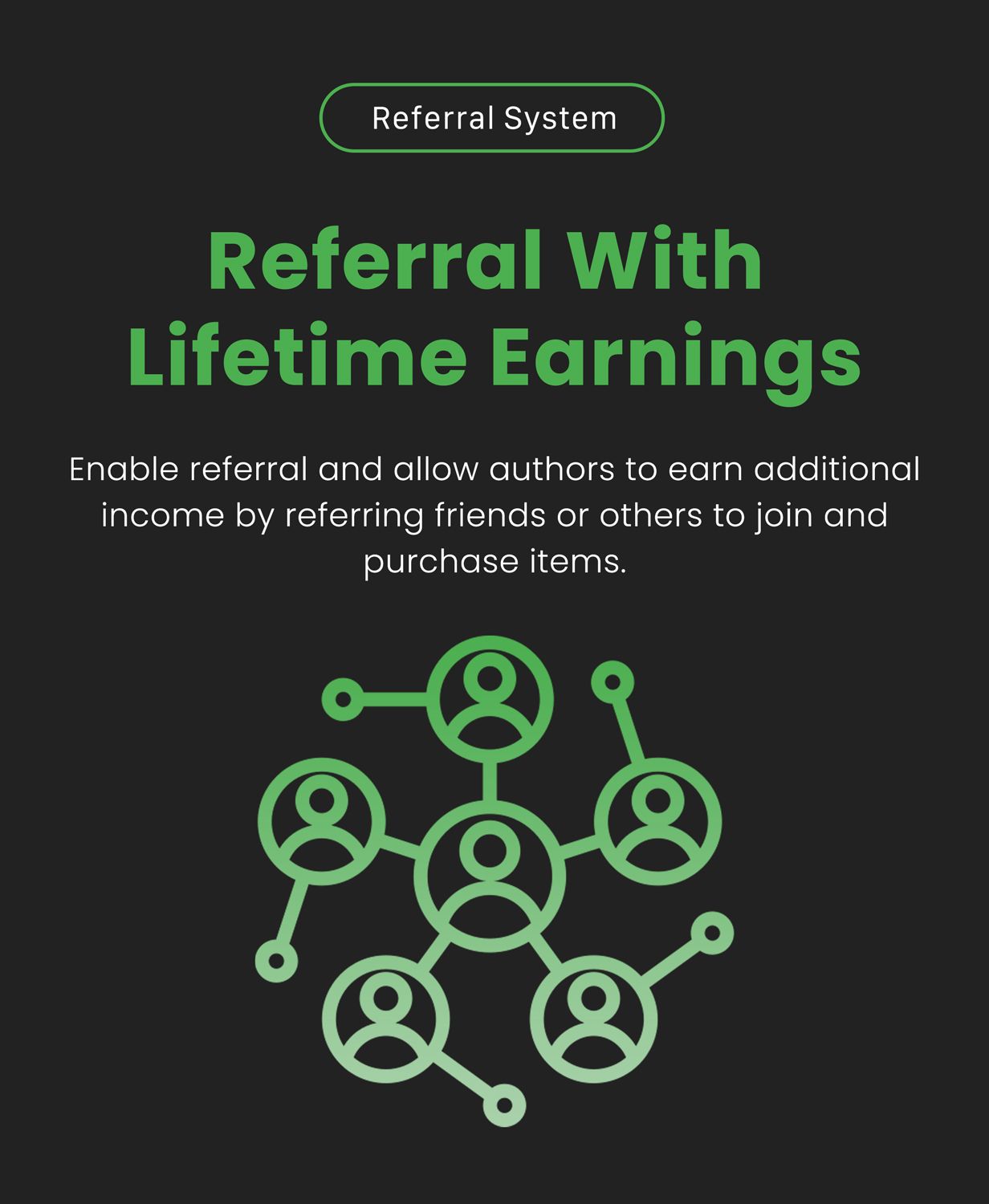 - Authors can earn commissions through a referral system when referred users register and purchase items.