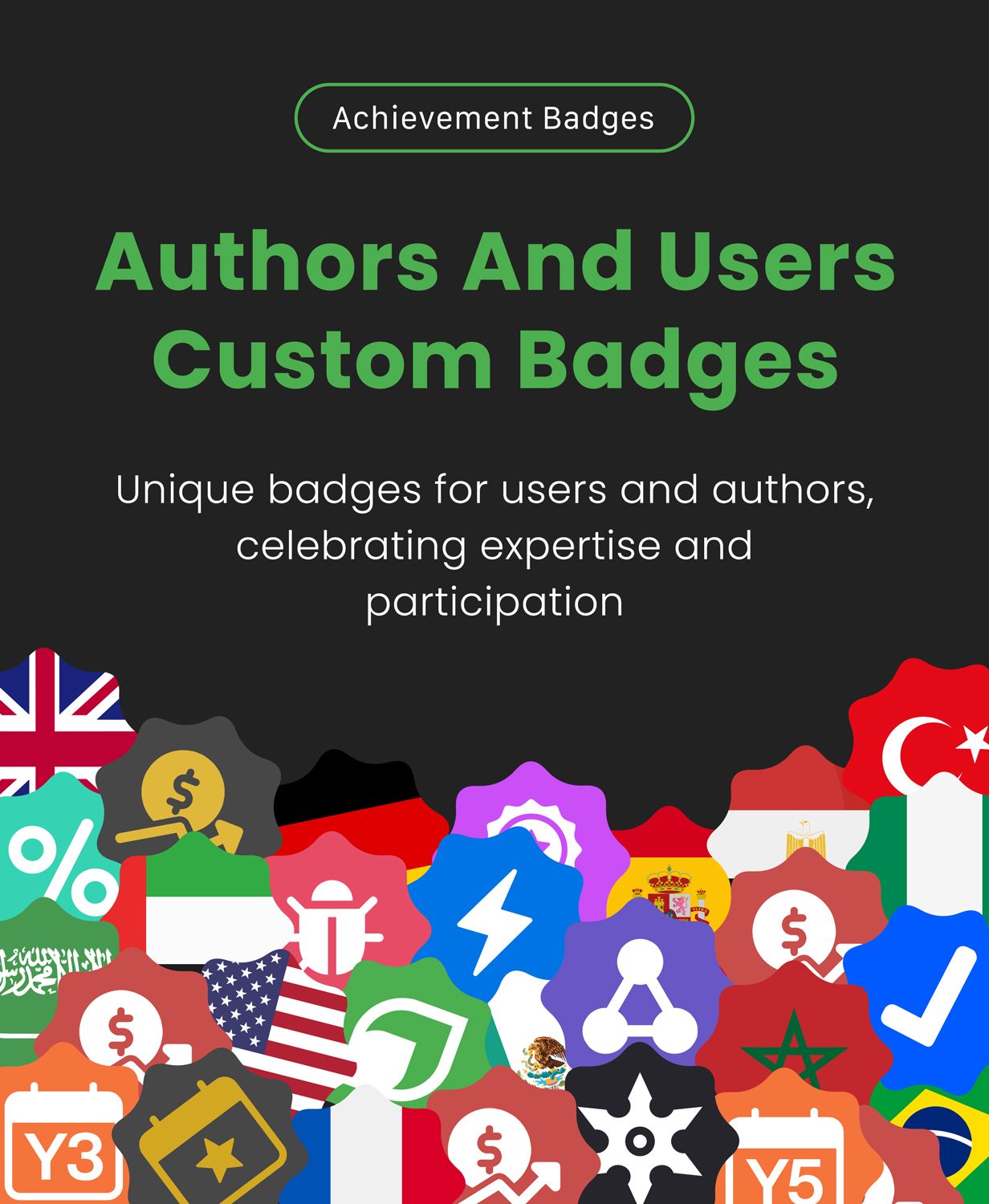 - Authors and users can earn badges for various achievements and milestones.