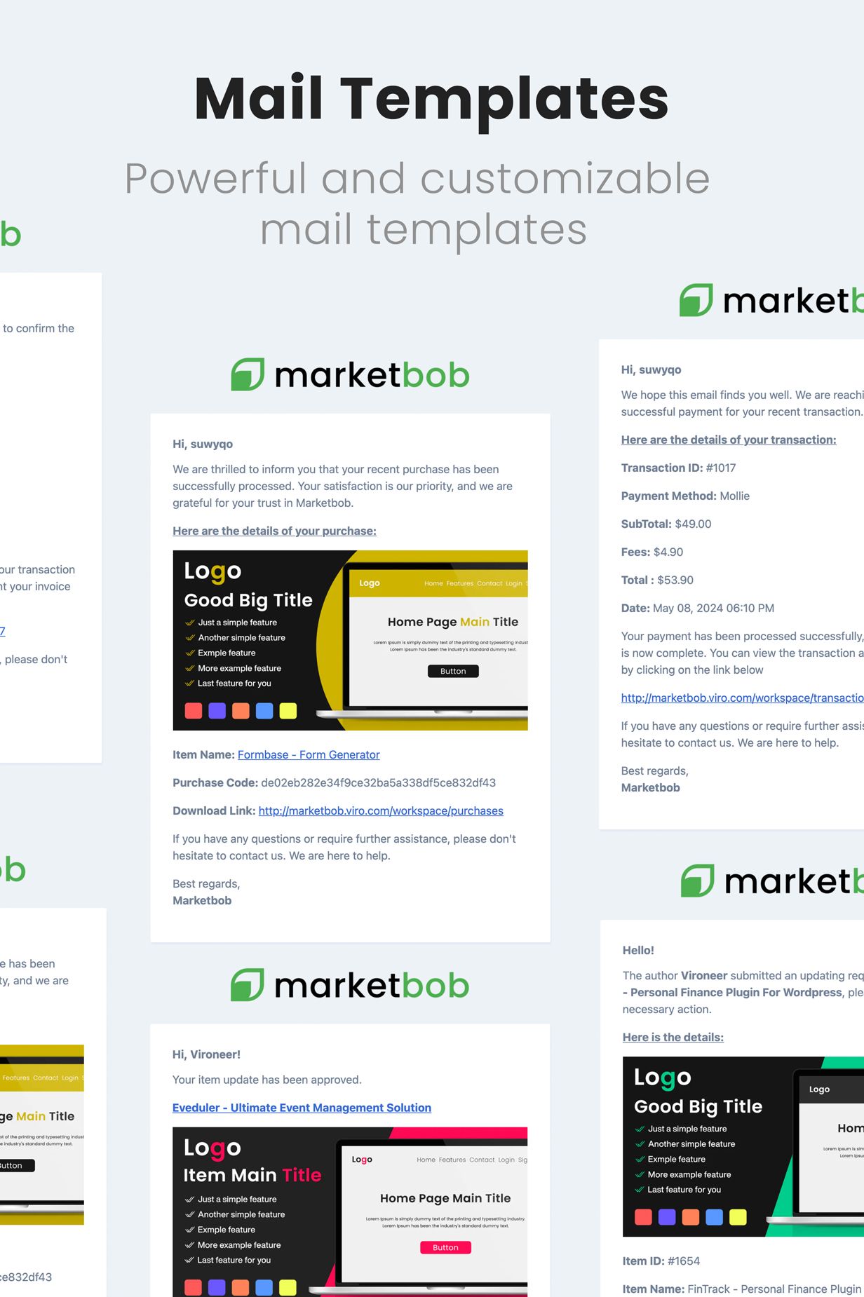 - Comprehensive email notifications for authors and users about purchases, item statuses, and more.