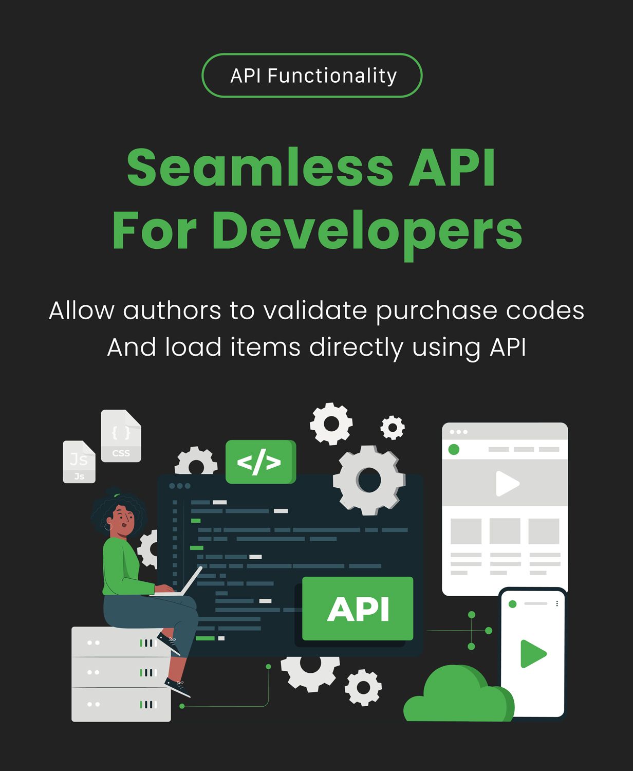 - API for authors and users to validate purchase codes, load items, get account details and more with full documentation.