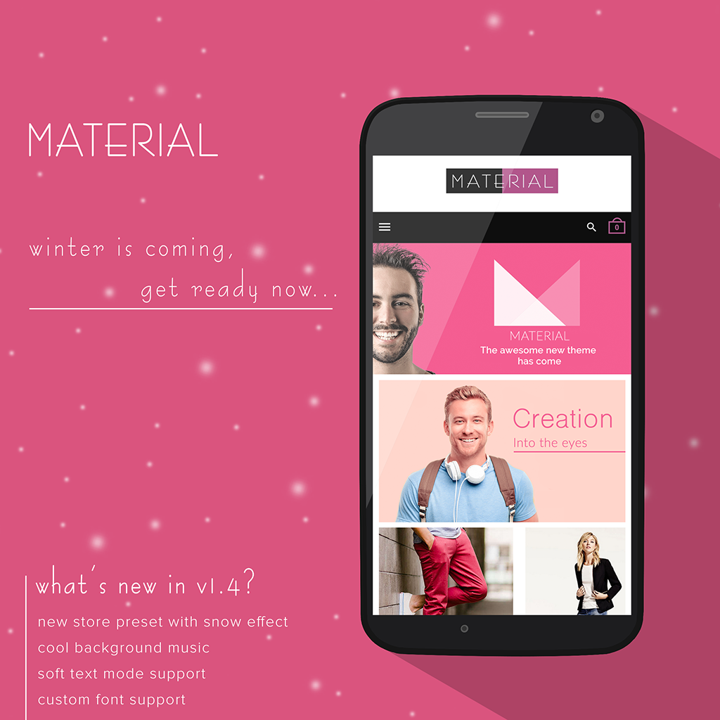We are proud to launch our next Shopify Theme – Material! Material has a new layout with gorgeous look. Every bite of it is beautiful & graceful. It synthesizes the classic principles of good design with the innovation and possibility of technology. This is material design.