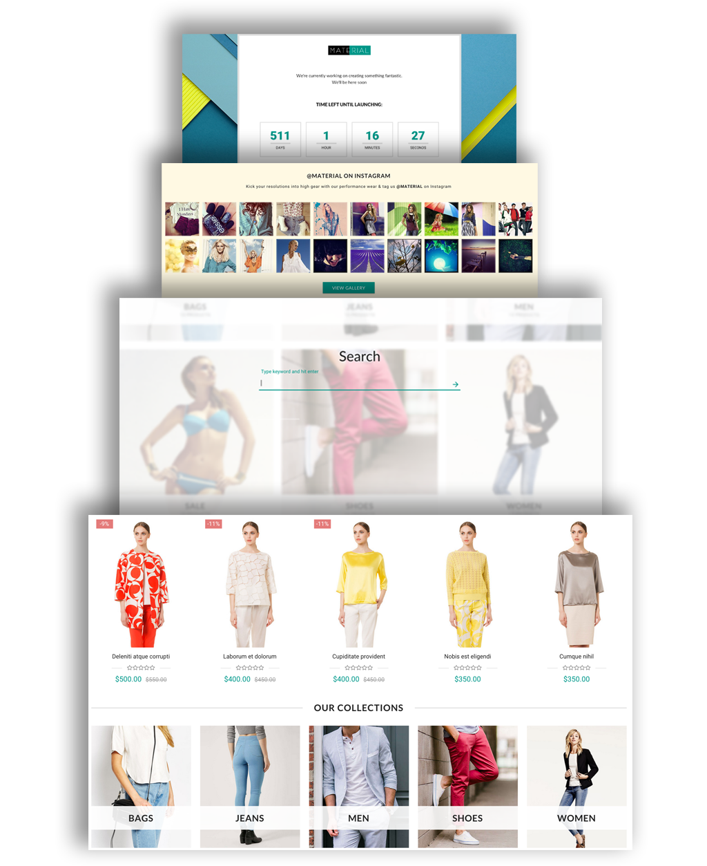 A lot of essential features came with Material. We wanted to make sure every detail was perfect, so we integrated Advanced Filter Module, Instagram Feed, QuickShop, Color Swatches, Video Module, Infinite Scoll… to give you the best UX.