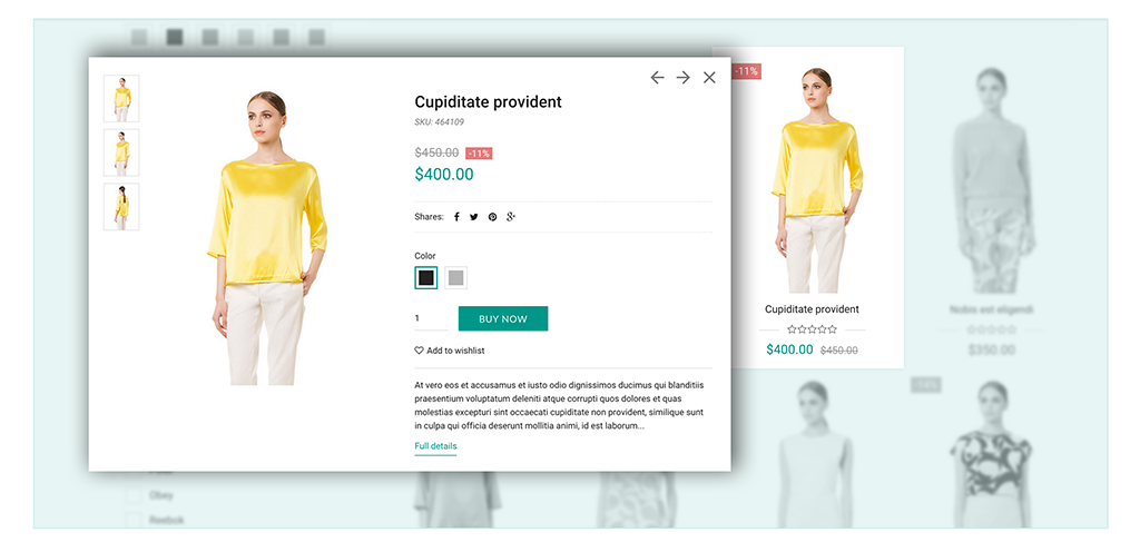 This feature helps your customers preview a product without opening it. It also helps go to next/previous product right on the QuickShop pop-up. Being improved with the new technology, the QuickShop almost has no delay in opening, faster than ever.