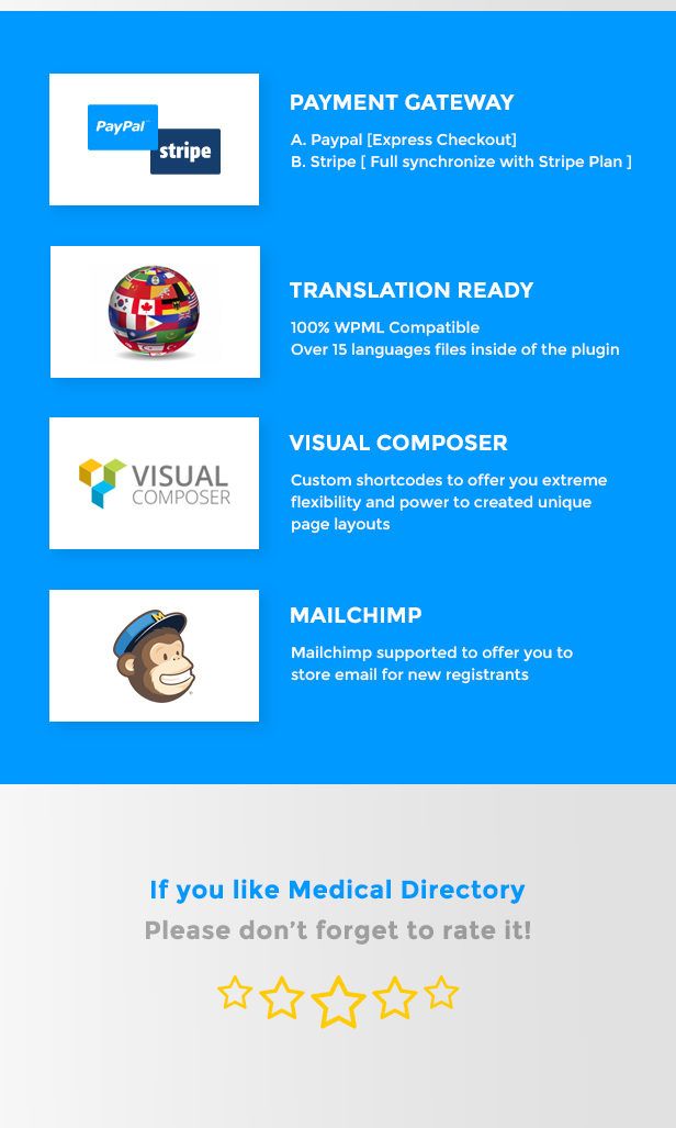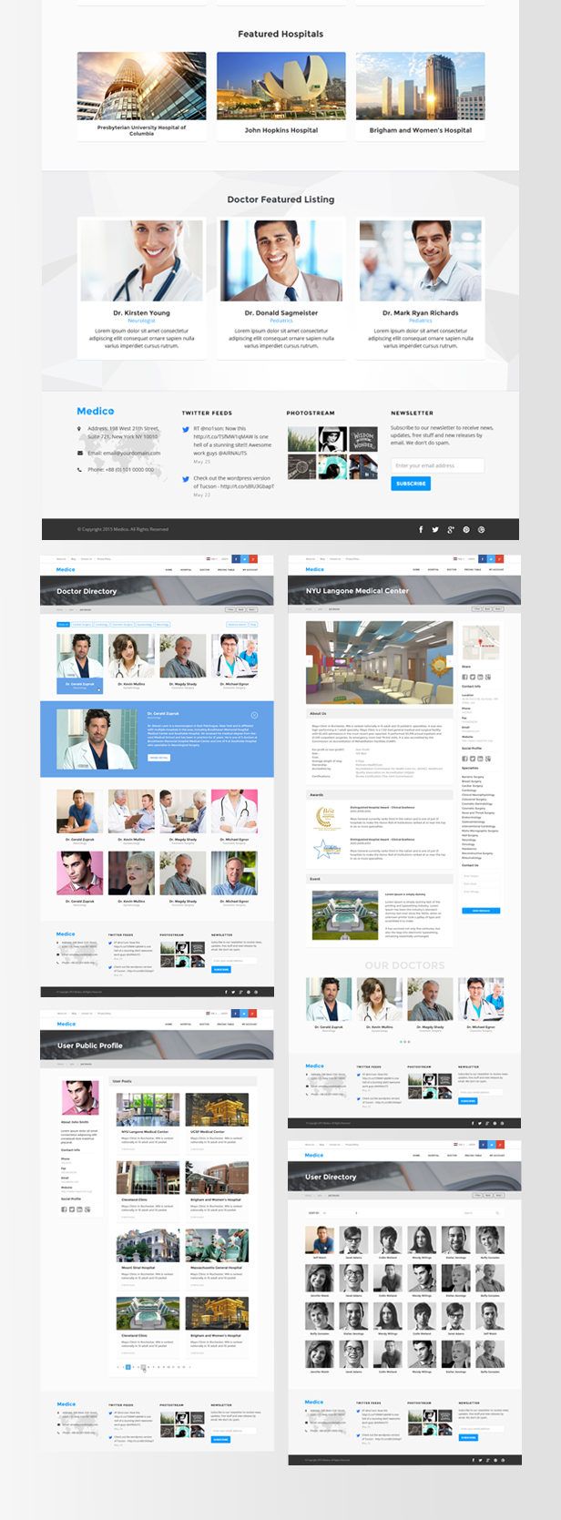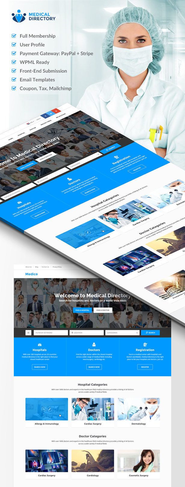 Medical Directory is a hospital and doctor listing WordPress theme with front-end listing submit option. User can login and register create their profile, manage and publish listing from their front-end user page. This theme supports any woocommerce payment gateway and woocommerce subscription