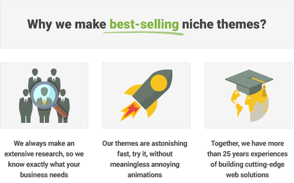 Strictly Coded by WordPress Standards and BeyondCompatibility and code quality are equally important as the visual appearance of the theme. Our products are fully developer friendly and easy to customize or add new functionality. |