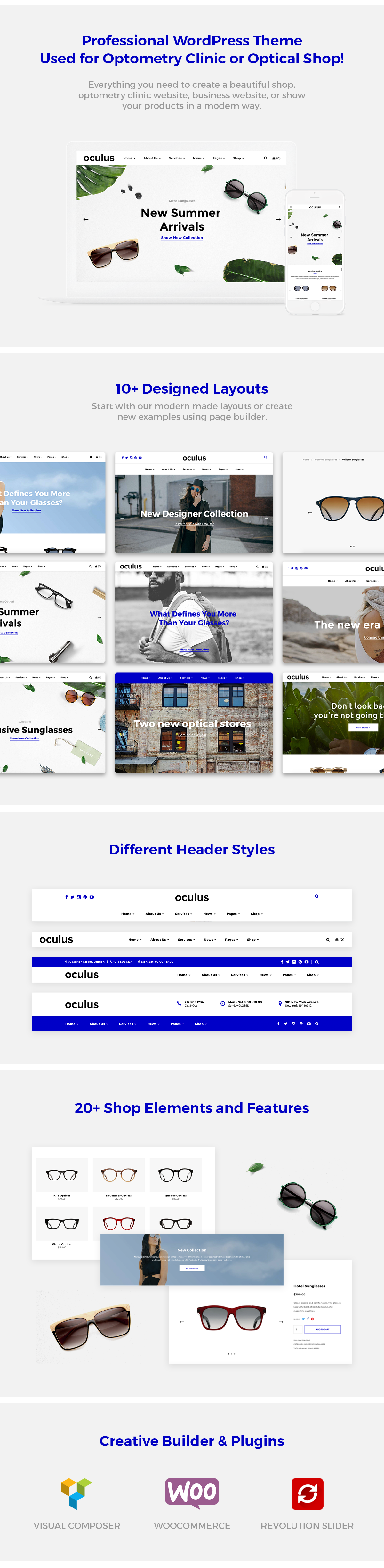 Oculus is a fully responsive Optical Theme that can be used for optical shop, optometry clinic. Also can be ideal for handmade, fashion, sunglasses, watches, jewelry, accessories and so many more. Creative and Multi-Concept business theme that includes everything you need for your perfect online store.