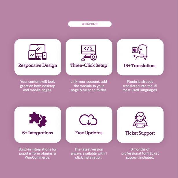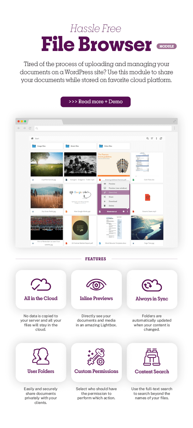 Out-of-the-Box user-friendly modules saves you tons of time sharing and managing documents and media on your WordPress site, keeping your content in the Cloud.