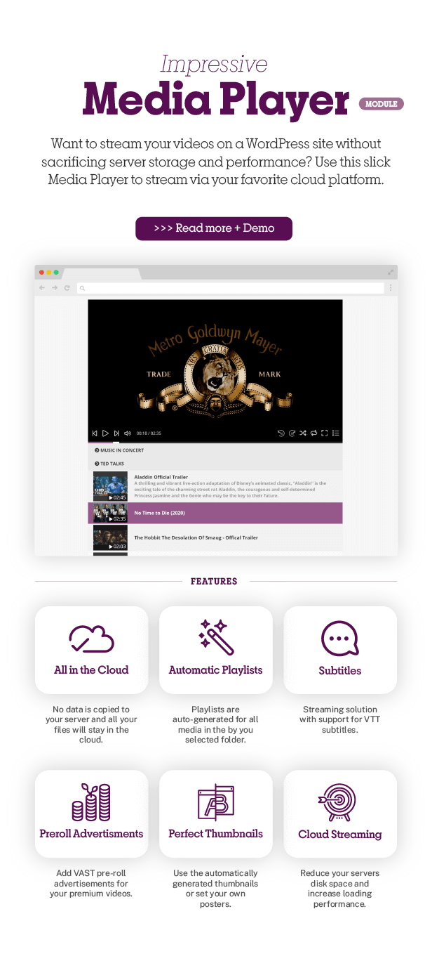 Stream your media files directly from the cloud with a HTML 5 mediaplayer. The Media Player has an amazing skin and
