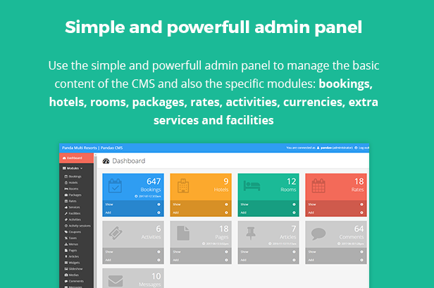 Several new specific modules: bookings, hotels, rooms, rates, currencies, extra services and facilities.
