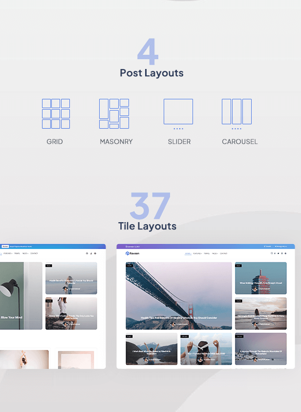 - Slider, Carousel, Grid & Masonry Post Layouts