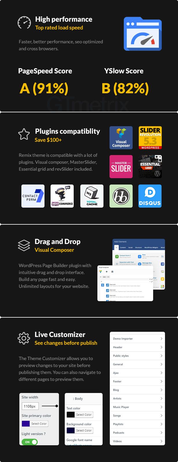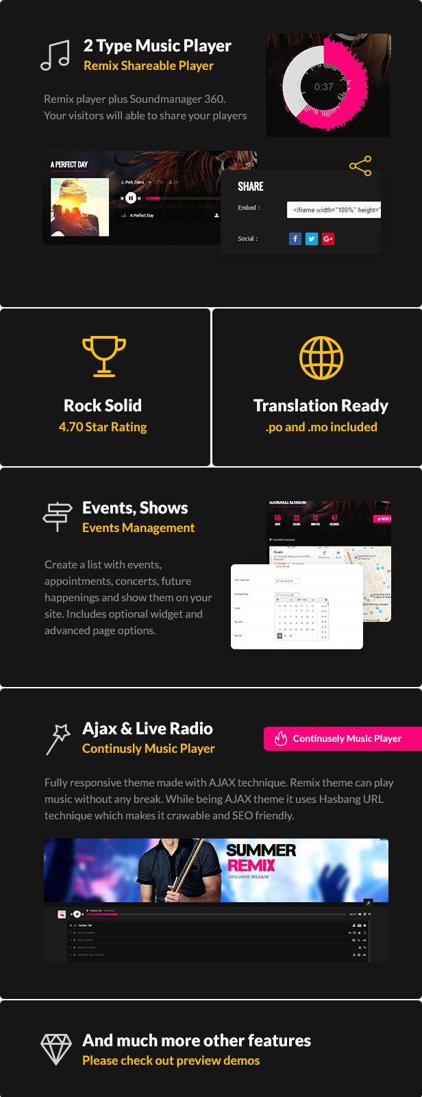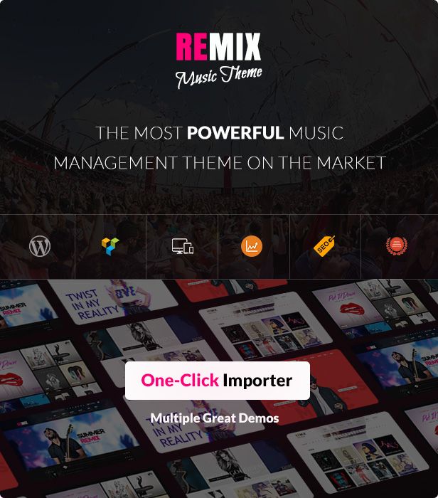 Remix AJAX is modern WordPress theme for music sharing, Multipage + One page theme with AJAX technique and with responsive layout built using 12 column grid system, Supports unlimited colours and sidebars, Suitable for music, band, club, party, event, magazine, classic, podcast, podcasts, artist, jazz master, punk rocker, soprano singer, piano player, band manager or even a webmaster, etc websites. Integrated with Visual composer Drag n Drop Page Builder, Revolution slider and master slider premium wordpress plugins (all worth $100+) saves you handsome money and embed MP3, Soundcloud, Shoutcast and radionomy audio. Masonry and listing blocks for all post types. Finally remix is best WordPress music theme 2018 for music lovers.