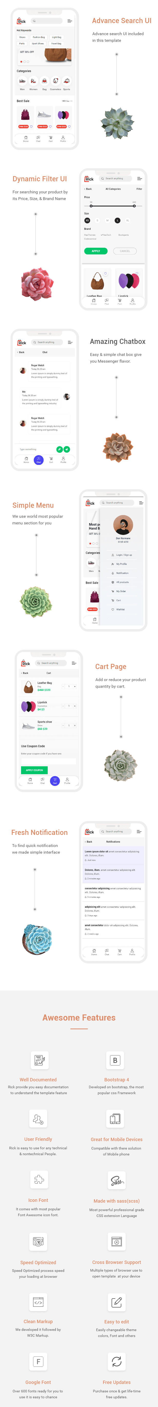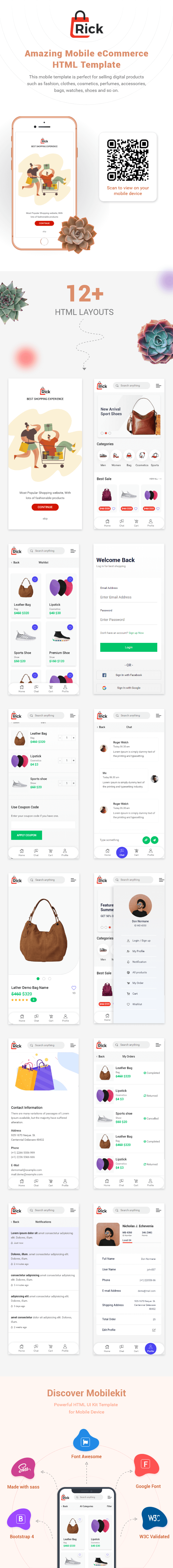Rick – Bootstrap Mobile eCommerce HTML Template is a modern, excellent and real eCommerce HTML 5 template. This new Mobile app design template is exceptional for its beautiful Mobile ui design. This mobile template is perfect for selling digital products such as fashion, clothes, cosmetics, perfumes, accessories, bags, watches, shoes and soon.