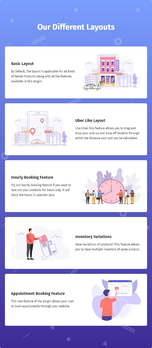 So far you can use this plugin for multiple uses. Such as car rent, hotel booking, property rent and lot more.