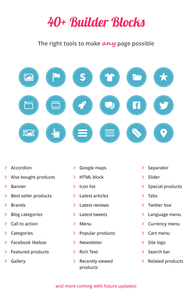 Page templatesYou can save your custom layout astemplate and use it for as many pages as you like. No more wasting time to build everything from scratch. |