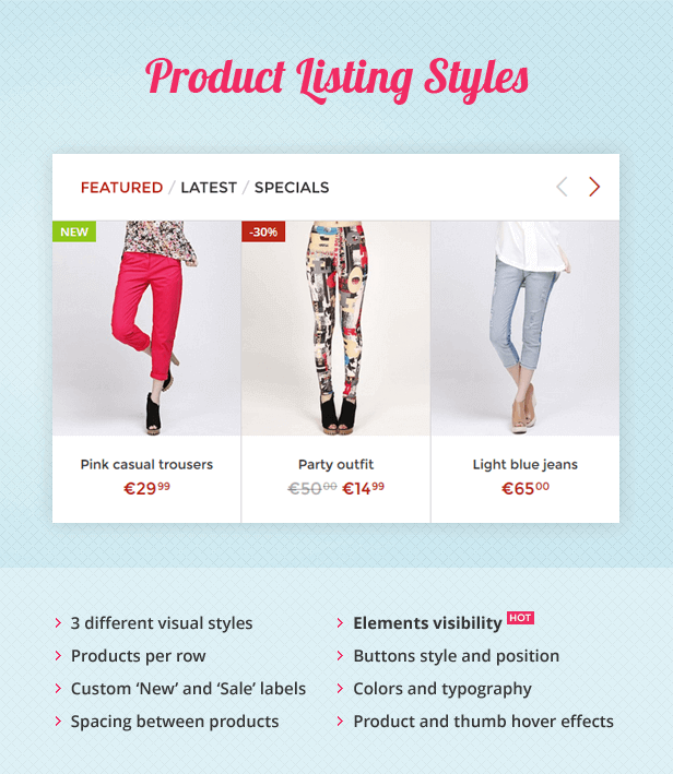 Custom Product PagesEasily change the OpenCart productpage layout. Choose between several variants with different elements position and configure thumbnail size, images zoom and product options style. |