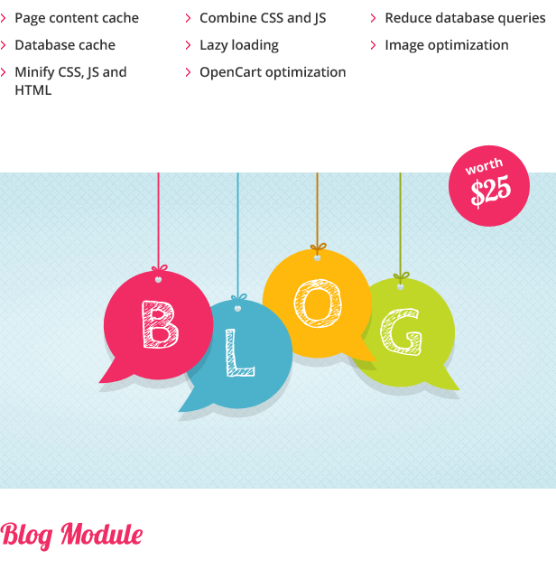 We analyzed some of the OpenCart’s weak points and created an extension in order to improve them. According to our test, your shop will be faster than default OpenCart installation. There are also various frontend optimizations to maximize user experience and hit better results in page speed tests.