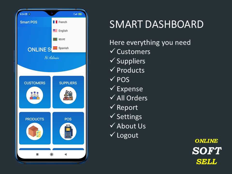 Smart POS is an online-based point-of-sale system for Android devices with a Web Admin panel to manage the pos system. It is a very useful online point-of-sale system for android mobile devices or tablets. By using Smart POS, you can easily maintain all kinds of products and sales records. You can store customer and supplier information. You can easily see your daily, weekly, monthly, and yearly reports with a bar chart. Smart POS has multiple languages (English, Spanish, Bangla, French) facilities. You can sell products from an Android device or tablet and manage the pos system from the web panel. All data is stored on an online server. There are three types of users- Admin, Manager, and Staff. Also, have user access limitations. You can manage your sales smartly from any time anywhere.