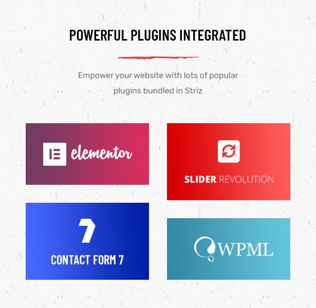 Striz is packed with many powerful plugins: Elementor, Slider Revolution, Contact Form 7, WPML, SEO Ready, One Click Install, etc. They are integrated to help you create one of the best fashion online store for your business.